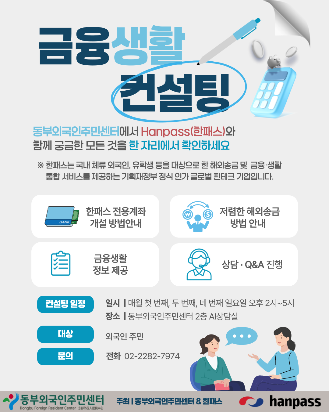 [2026년 금융생활컨설팅 안내] 매월 첫 번째, 두 번째, 네 번째 일요일 오후 2시부터 5시까지 동부외국인주민센터 2층 AI상담실에서 금융생활컨설팅을 제공해드립니다. 한패스와 함께 한패스 전용 계좌개설, 저렴한 해외송금 등에 대해 상담 받으세요. - 컨설팅 일시 : 매월 첫 번째, 두 번째, 네 번째 일요일 오후 2시~5시 - 컨설팅 장소 : 동부외국인주민센터 2층 AI상담실 - 대상 : 외국인 주민 - 문의 : 전화 02-2282-7974  |