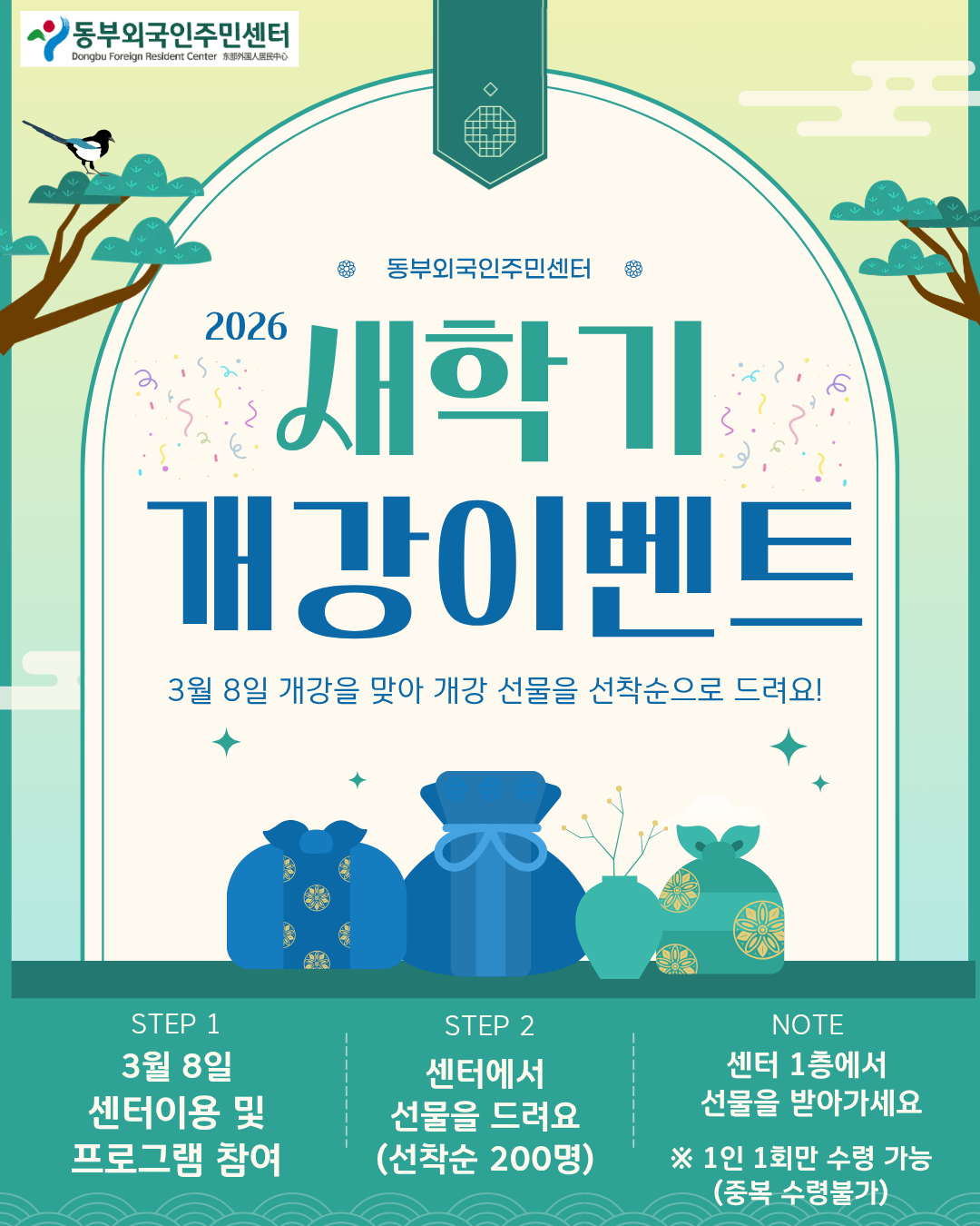 개강을 맞이하여 동부외국인주민센터를 이용해주시는 여러분을 위해 선물을 준비했습니다.