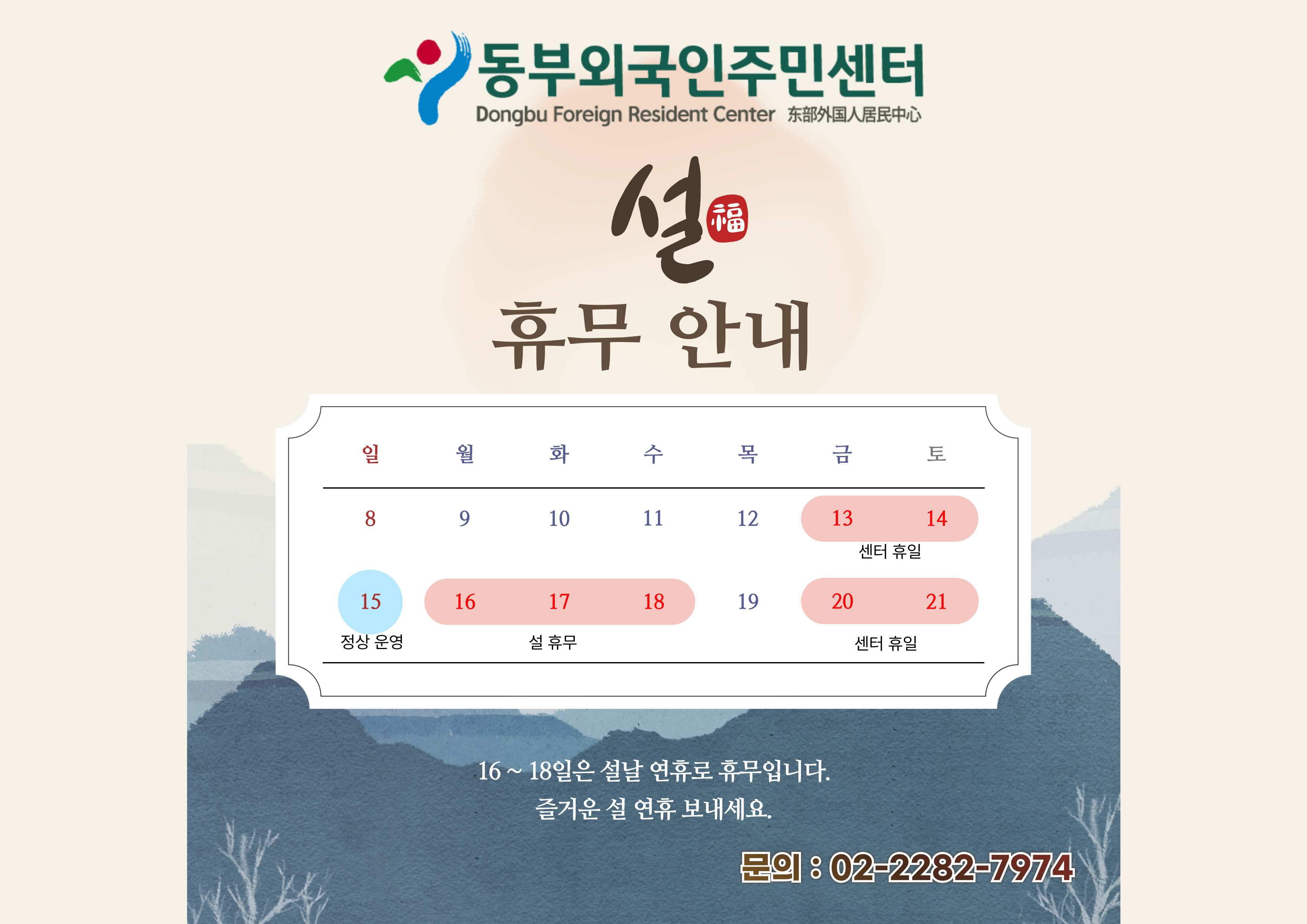 [동부외국인주민센터 설연휴 관련 2월 휴관 안내]