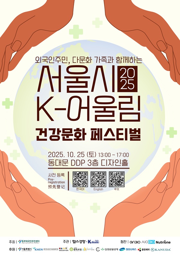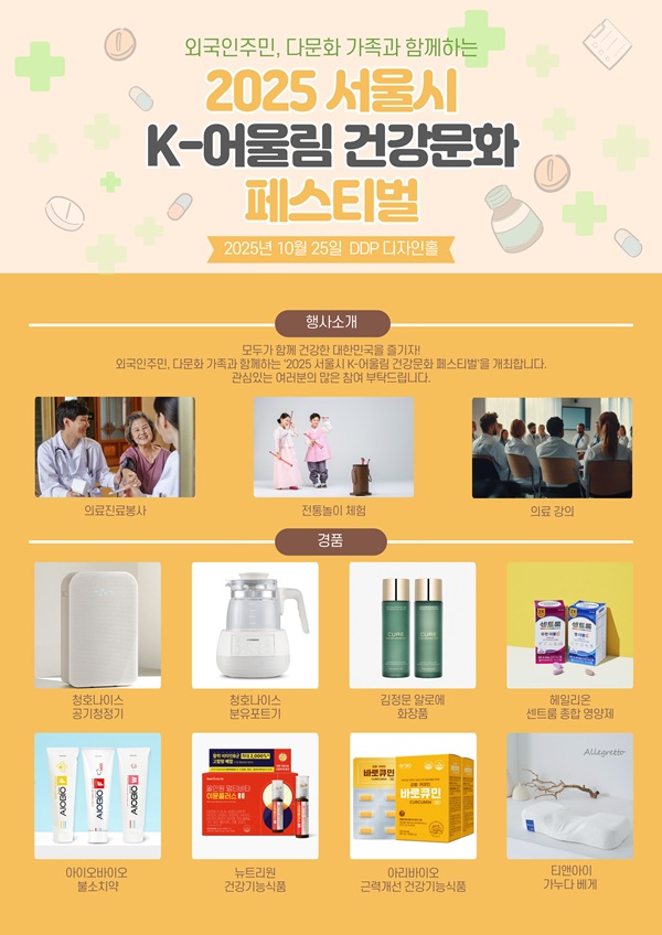 ☆ 서울시 K-어울림 건강문화 페스티벌 ☆ 내·외국인이 함께하는 건강과 문화의 축제! ? ▶ 일시: 2025년 10월 25일(토) 오후 1시 30분 ▶ 장소: 동대문디자인플라자(DDP) 3층 디자인홀 ▶ 참여대상: 내·외국인, 다문화가정, 유학생, 청소년 등 약 300명 ? ▷ 주요 프로그램